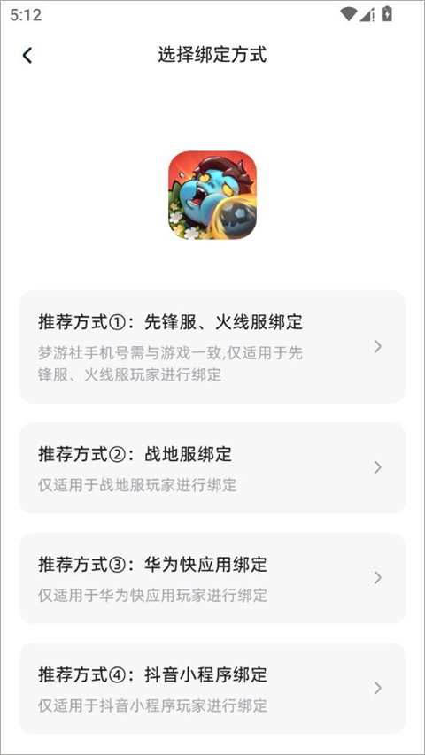 4、选择对应服务器进行绑定:支持先锋服、火线服、战地服、华为快应用、抖音小程序五种方式