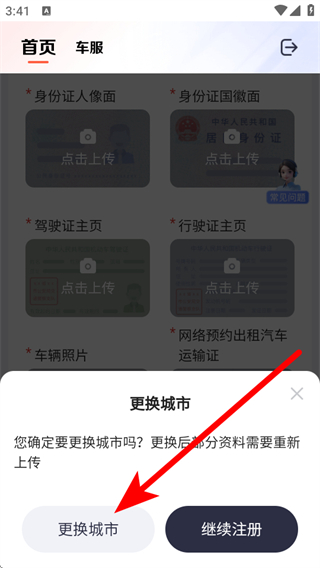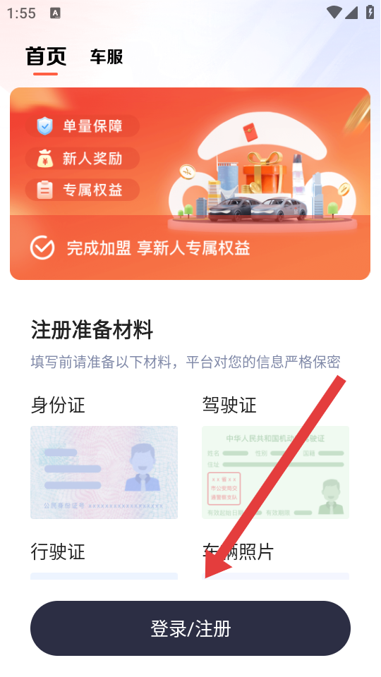 2、按指引上传身份证正反面、驾驶证、行驶证及车辆外观照片,点击【登录/注册】提交资质审核申请。