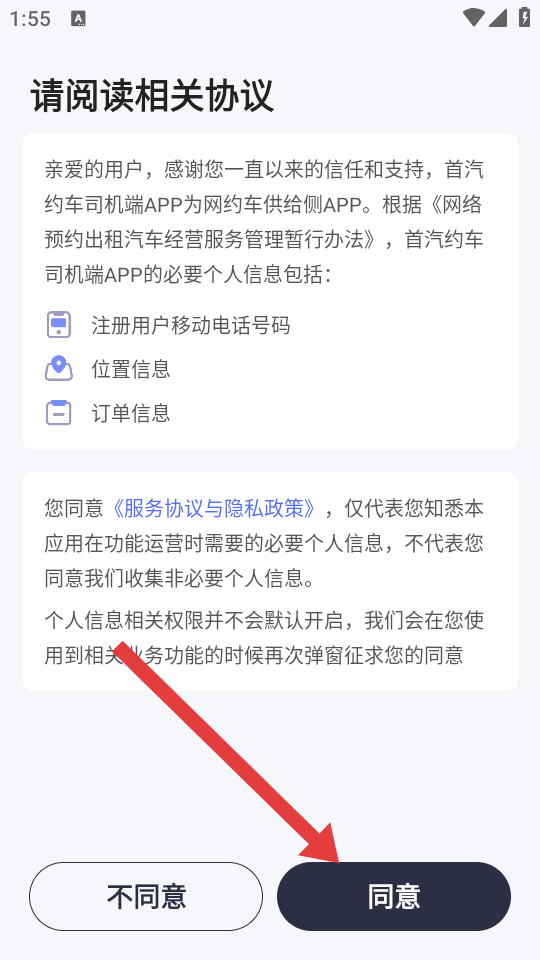 1、首次启动APP,需完整阅读《用户协议》及《隐私政策》,勾选同意后进入注册流程。