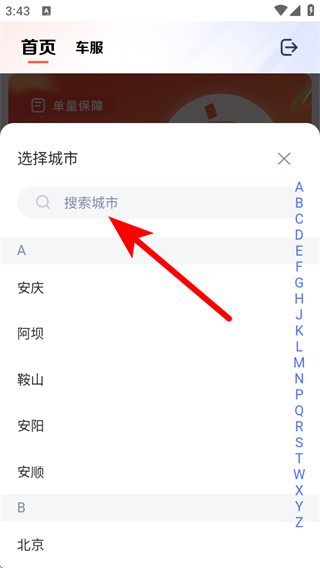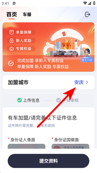 1、打开首汽约车司机端首页,点击右上角“加盟城市”旁显示的当前城市(如“安庆”)。