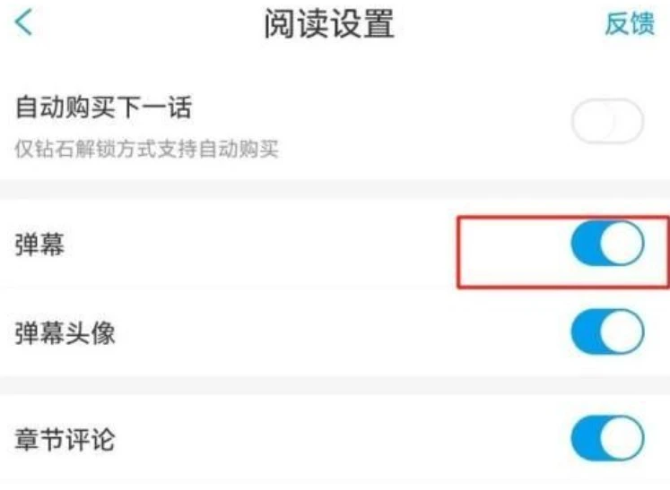 第三步:选择【阅读设置】→ 找到【弹幕】选项 → 点击右侧开关按钮(由蓝色变为灰色即代表已关闭)。