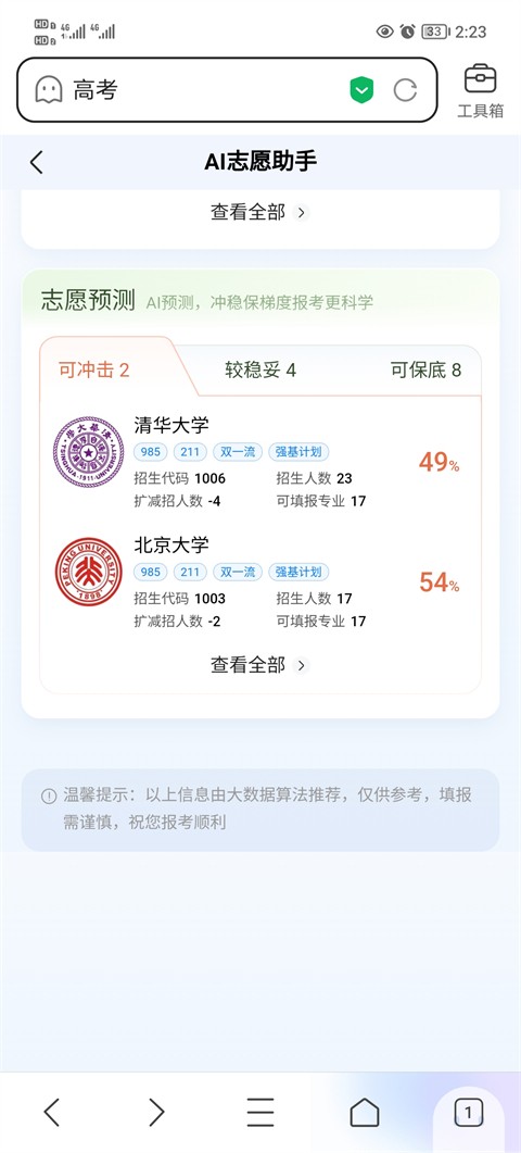 6、继续下拉页面,即可查看“冲刺院校”“稳妥选择”与“保底学校”三类报考建议,科学规划志愿填报策略。