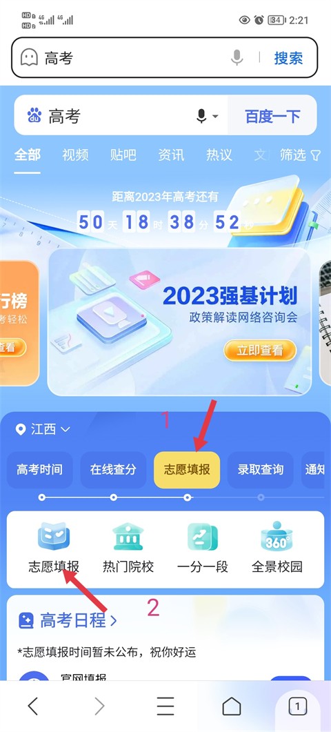 2、在搜索结果页找到“志愿填报”入口,点击进入相关服务;