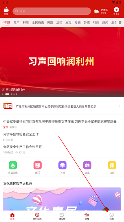 - 打开利州融媒App首页,点击底部导航栏中的“个人中心”;