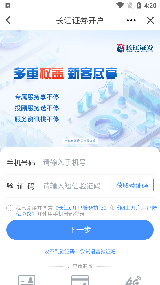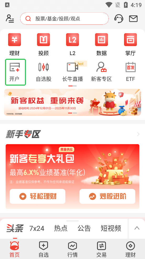 1. 打开长江e号App,点击首页“开户”入口。