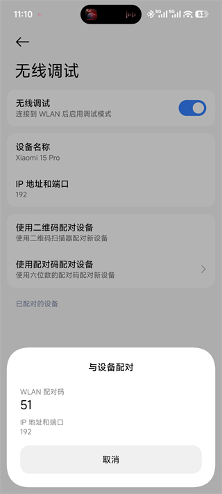 5、返回【开发者选项】,找到“无线调试”,记录显示的配对码;随后下拉通知栏,在弹出的配对窗口中输入该配对码完成连接。