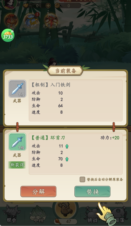 拿到【环首刀】后立即替换旧武器,它不只是攻击+10,更附带“破甲”被动——对高防敌人额外生效。淘汰的旧装别急着卖,留着合成【锻铁膏】,后期强化神兵时缺不了。