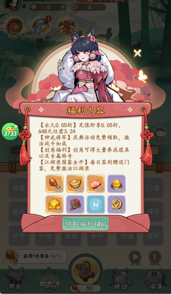 全服永久生效的0.05折充值特权,648元豪礼实付仅3.24元,省下的不是数字,是更多闯荡时间。