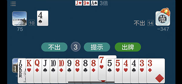 地主收走三张底牌并公开展示,随后由地主率先出牌,其余两人依序跟牌。每次出牌需符合牌型规则且大于上家,也可选择“不出”。任意一方清空手牌即宣告本局结束。