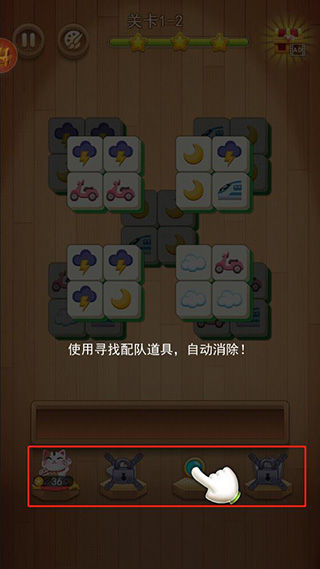 道具栏提供三类辅助:配对高亮可瞬时标出全场所有可行三连组合;