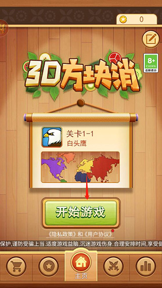 安装完成启动应用,主界面直接点击“开始”进入首关;