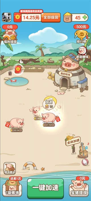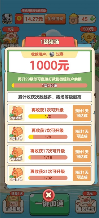 每次成功售出小猪都会累积经验,推动猪场升级,最高可达35级,每升一级不仅开放新功能,还赠送即时红包或加速道具。