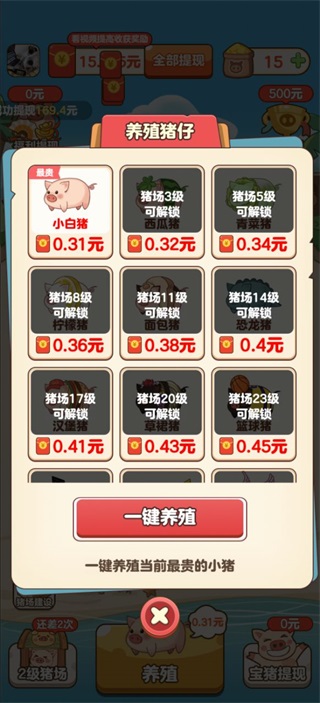 养殖不同品种的小猪,成长周期越长、品种越稀有,收获的红包越丰厚;猪场等级决定可养猪种上限,高等级猪场能解锁高回报猪崽。