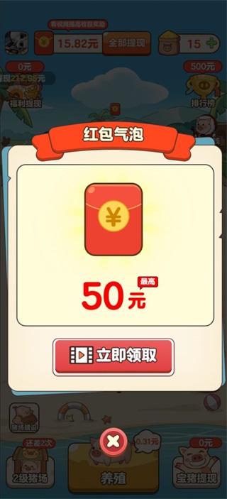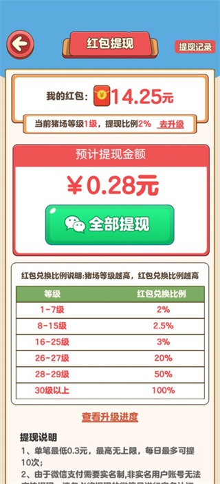 红包提现门槛低至0.3元,但实际到账金额受猪场等级制约——等级越高,相同红包面额对应的可提成比例越高,满级时接近全额兑现。