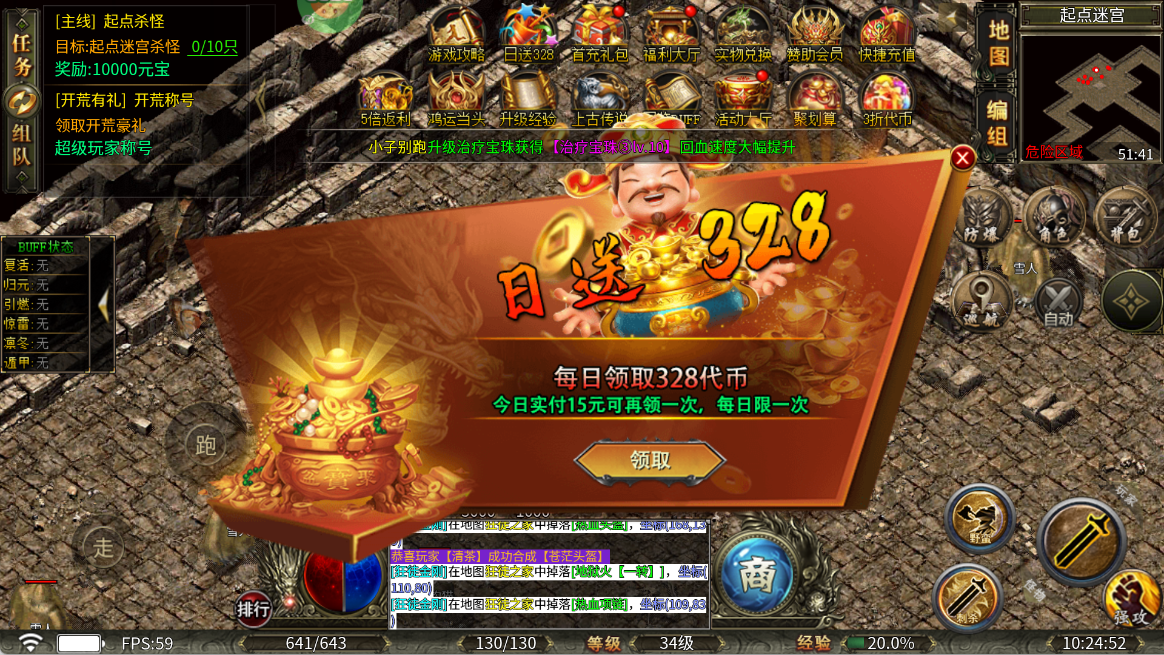 ★上线福利★ 每天登录就送328代币,可直接兑换稀有礼包、强化石、传送符,手感堪比充值玩家
