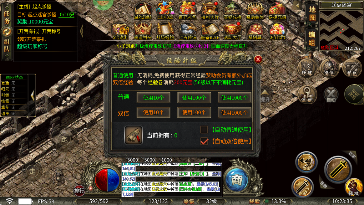 等级未达56级前,开启双倍经验卷自动使用开关,挂机刷图即涨经验,属性成长肉眼可见。