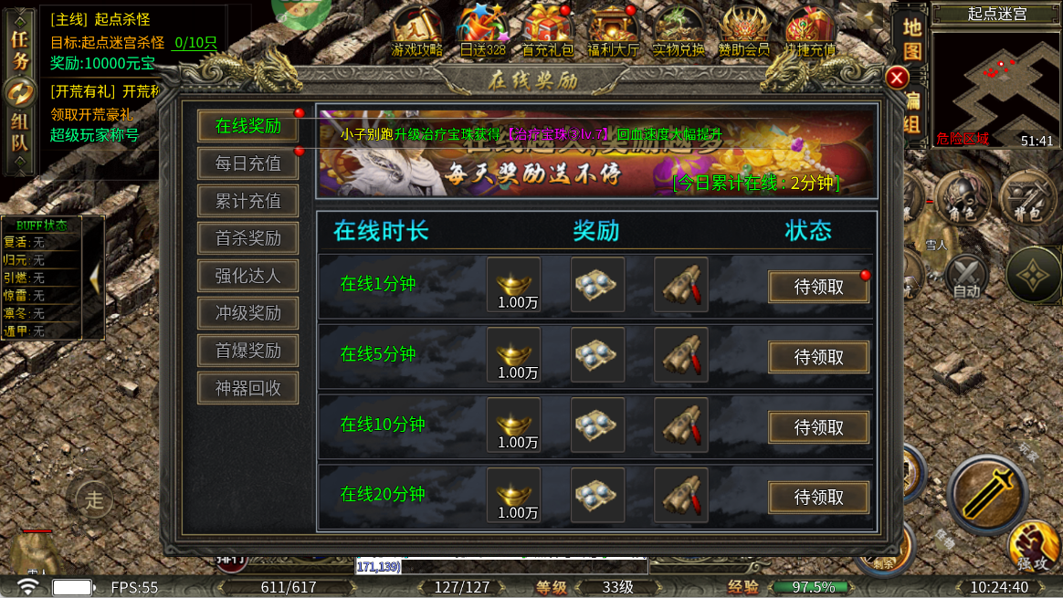 ★在线奖励★ 挂机满30分钟、60分钟、120分钟自动弹出奖励箱,金币、经验药水、锻造卷轴全都有