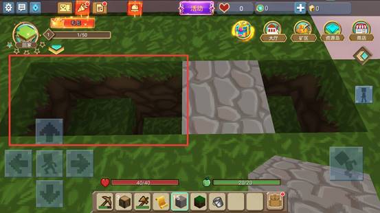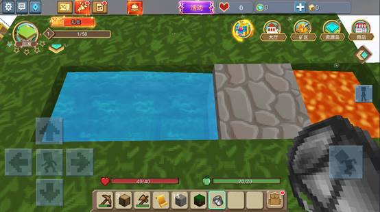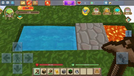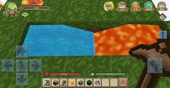 选址要避开水源干扰区,地面平整即可。左侧挖两格深坑放水,右侧挖一格浅坑放岩浆,注意水坑第二格必须下挖两格形成落差,否则水流无法自然下渗。