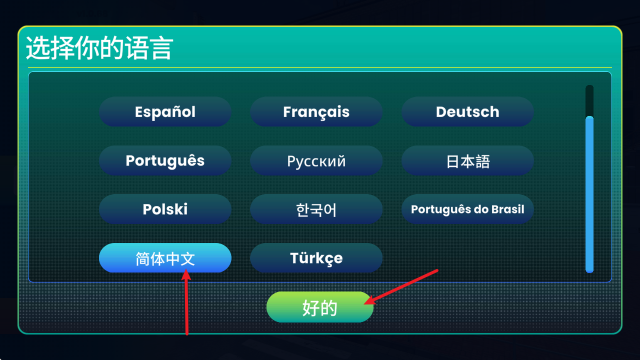 3、在语言菜单中选择“简体中文”,点击确认按钮生效。