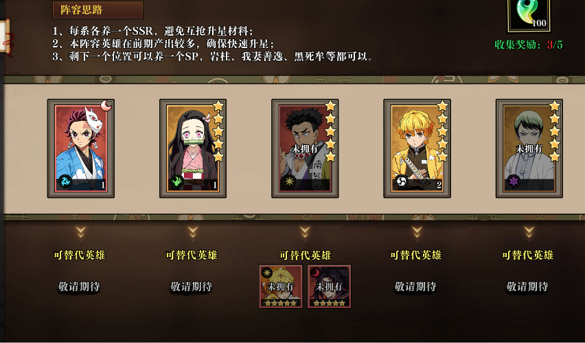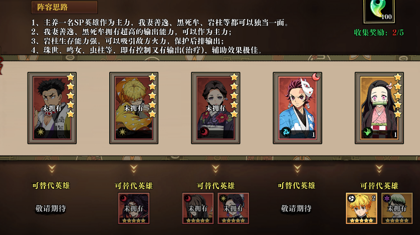 第五席灵活补位,SP岩柱扛压强,善逸爆发足,黑死牟压制稳,按需切换。