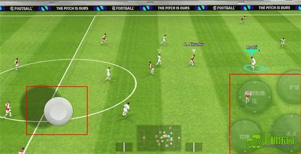 6、实战中左侧虚拟摇杆控制球员移动方向与加速度,右侧触控区集成五维动作轴:轻点为短传,长按触发直塞,双击发动反越位,上滑施放挑传,下滑执行铲断