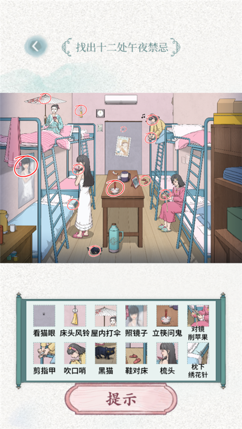 主题测试:聚焦强氛围设定,“午夜禁忌”十二禁忌关卡融合民俗心理与视觉暗示,点击猫眼见人影、拖出黑猫寻破绽,沉浸感拉满。