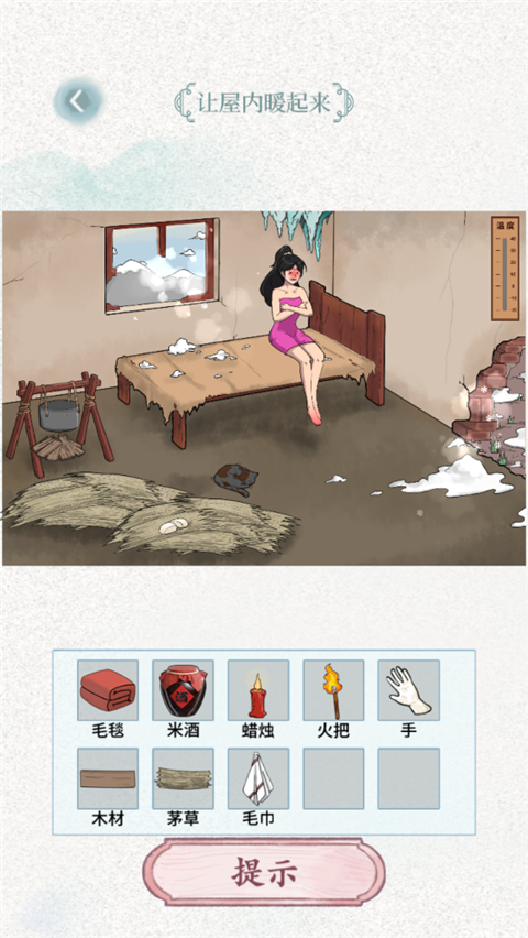 3、按因果顺序完成六步操作:补窗堵洞→点燃篝火→铺床赠毯→温酒奉上→蒸馍暖身→净猫慰心——每一步都是情境推理,通关即达成情感闭环。