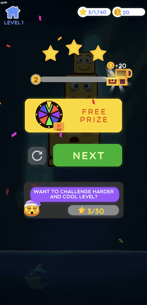 4、当堆叠塔触及关卡目标高度线,且结构保持稳定3秒,即触发“引力爆发”,自动吞噬剩余障碍并结算星级;