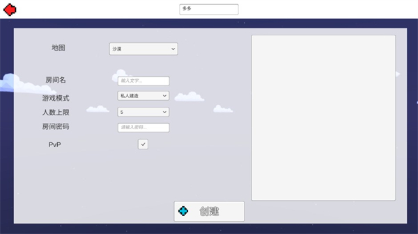 6、如需创建房间,填写名称、密码、最大人数及游戏规则后,点击【创建】即可生成专属世界;