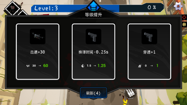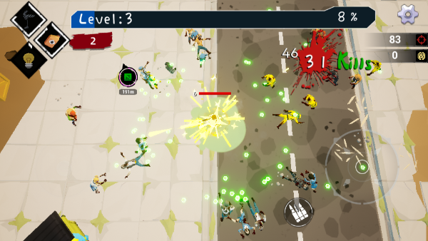 之后就可点击play进入游戏,滑动左边的轮盘可控制方向,在这里你需要躲避僵尸的攻击,并且射击他们,直到这座城的僵尸都被你干掉。