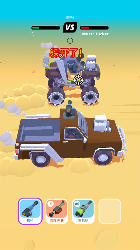 游戏摒弃静态站桩射击,全程以“移动即战场”为设计核心:你的战车永不停歇,敌人会周期性追击并列行驶,此时需灵活拉距、预判走位,并快速切换机枪扫射、火箭齐发或榴弹覆盖——射击不是暂停键,而是加速器;躲避不是闪避技,而是方向盘上的生死博弈。
