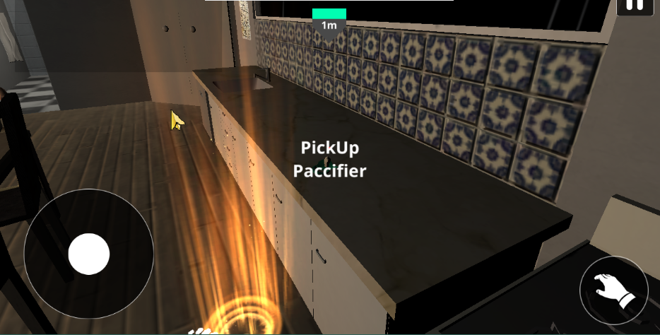 左侧虚拟摇杆控制移动,右侧按键执行抓取/使用,右上角【暂停】可临时喘息——现在,请走向前方的婴儿,完成首次接触