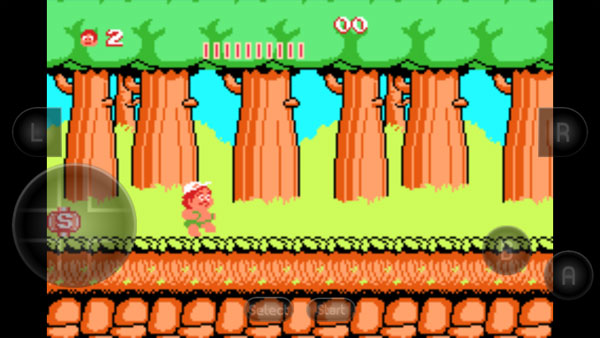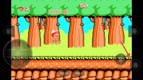第二步:边走边强|左右虚拟摇杆控制移动,A键跳跃跨越陷阱,途中狂吃水果补充体力,拾取蛋类解锁新能力(滑板加速、妖精护体、攻击力提升),滑板更是飞跃深渊、撞碎方块的关键载具。