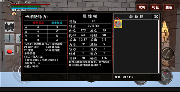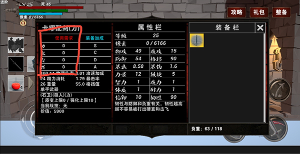 接着点击一个空白格,查看可装备的武器防具等,查看使用需求,如果玩家已满足,可以忽略