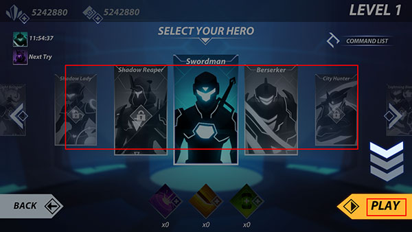 随后进入关卡选择界面,当前默认英雄为经典暗影形态,后续可通过收集材料解锁并培养专属角色;