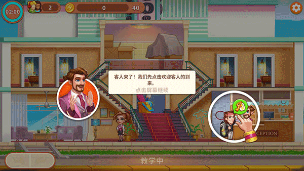 3、客人抵达后,点击迎接→办理入住→分配房间(匹配其头顶需求图标)→等待休息→点击退房→立即指派清洁工打扫;