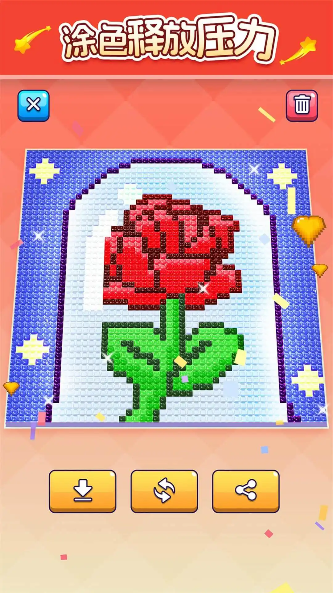 《宝石像素涂色》是一款融合休闲解压与策略挑战的创新型涂色闯关游戏。它以“宝石”为核心视觉语言,将传统填色玩法升级为动态光影交互体验——随着你逐层上色,像素图案渐次浮现,宝石随之焕发流光溢彩,场景亦随进度实时变幻。数百个精心设计的关卡层层递进,难度自然攀升却不失友好,新手可轻松入门,高手亦能持续挑战,是当下不可多得的“一眼爱上、一玩上瘾”的治愈系精品。