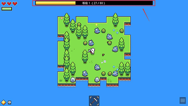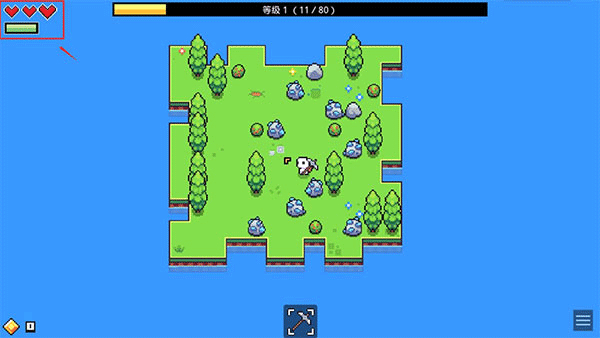 生命与能量系统:左上角绿色长条为饥饿值,红色爱心为健康值。饥饿归零将持续扣血;健康归零即游戏结束(支持读档重来)。二者上限均可通过技能/道具永久提升。
