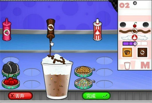 精细制作:依订单要求设定容器尺寸→选择对应口味冰淇淋→调控果酱搅拌时长(观察动态计时条)→均匀涂抹→注入鲜奶油→最后添加客户指定顶部配料。