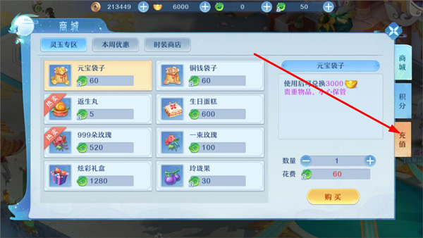 2、在商城页面中,可浏览灵玉礼包、本周特惠及时装商店,点击【充值】选项;