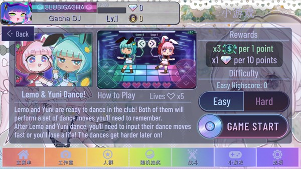 Lemo与Yuni会示范一组由方向键(上下左右及两侧)组成的舞步,玩家需准确复现。共有5次容错机会,操作错误即扣1次,机会耗尽则游戏结束。