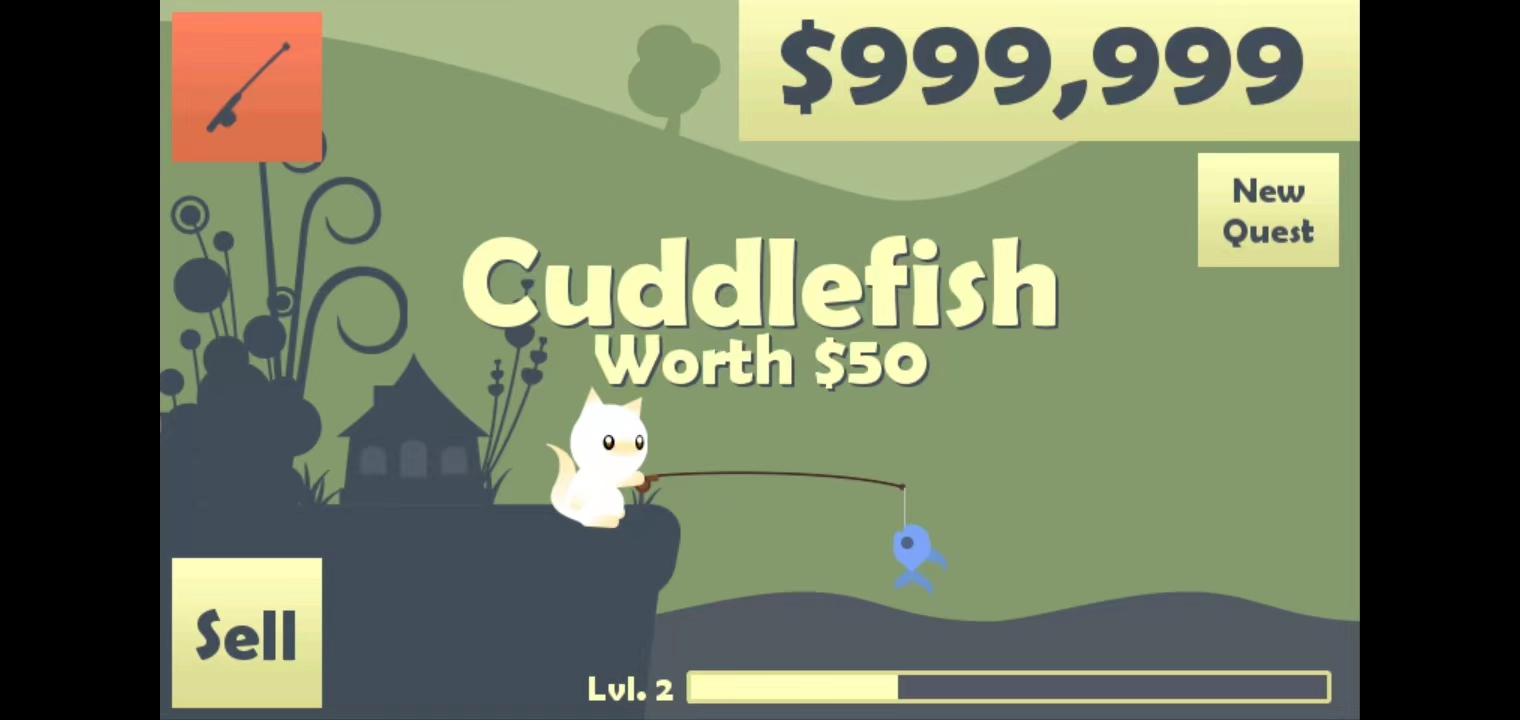 2. 当鱼咬钩时,长按屏幕即可收线提竿;成功钓起后会获得金币奖励,点击左下角【Sell】按钮即可出售鱼类,兑换金币用于后续升级。