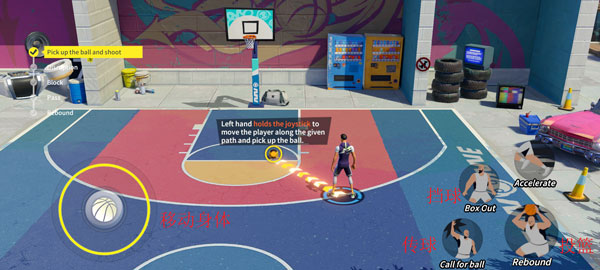 1、进入游戏后,在比赛界面左下角通过虚拟摇杆控制角色移动,右下角设有传球、投篮、技能等操作按钮,轻松实现精准操控。