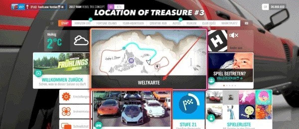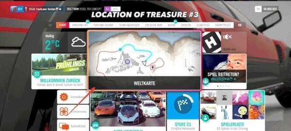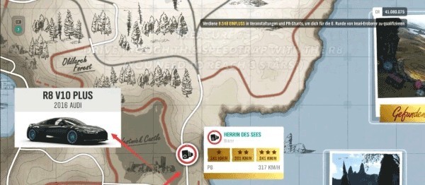 2、在世界地图中定位“财富岛宝藏2”,选择前往该宝藏的路线,并留意任务所指定的比赛车型要求。