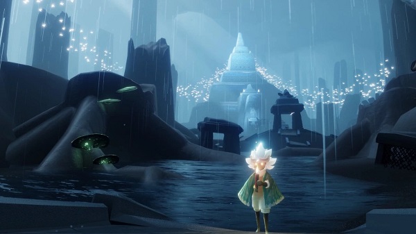 穿越云野最高处的宫殿后,天色渐暗、云层厚重、细雨飘落,你将抵达《Sky光·遇》的第三章场景——雨林。