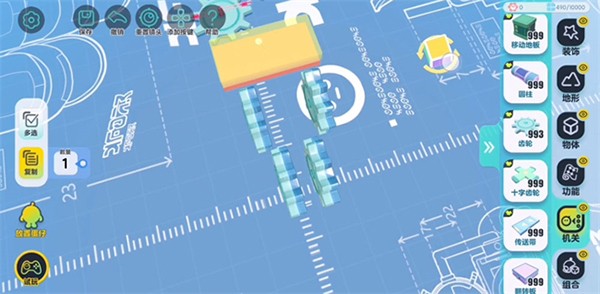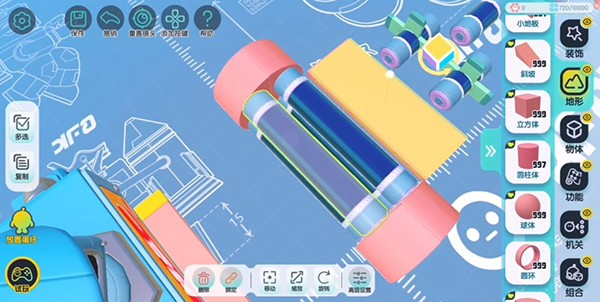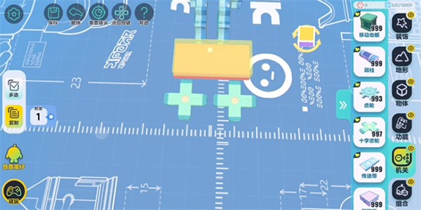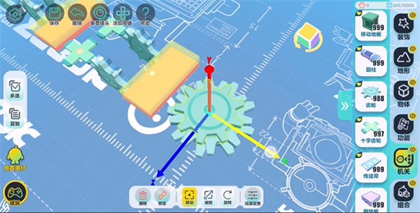 在开始搭建前,建议将编辑视角切换为【上帝视角】,便于全局把控布局。从机关库中拖出“齿轮”后,可通过以下步骤进行精细化调整: