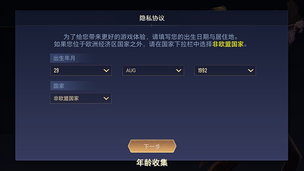 - 首次进入游戏需填写国家与年龄信息,注意:年龄不可设置过小,否则可能影响账号正常使用。