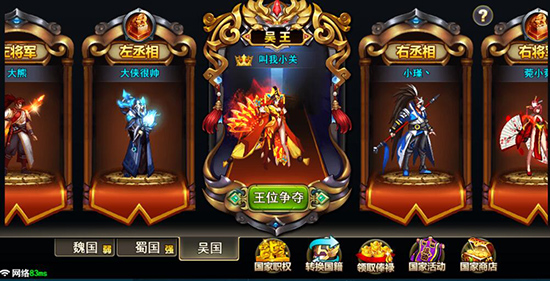 3. 社交体系深度结合三国背景,设立国家机构,玩家可竞选国王、丞相等职位,带领同袍参与国战、资源掠夺等大规模对抗。