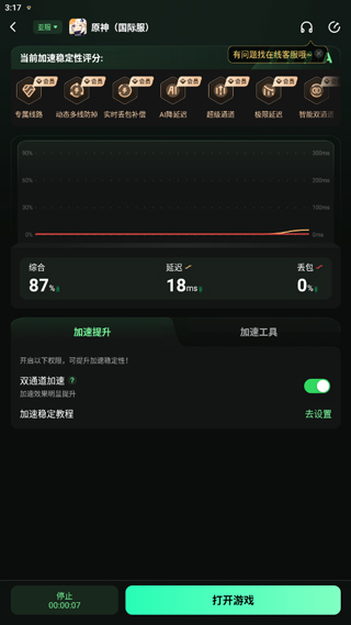 2、待加速完成后,点击页面下方“打开游戏”进入启动流程;