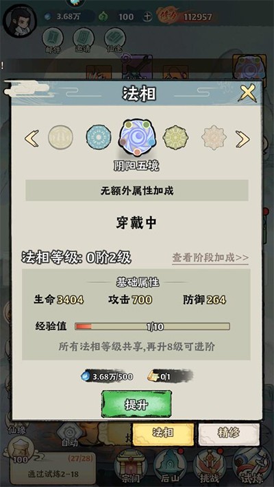 3、法相系统精修强化:点击右上角法相图标,消耗灵石与法相残篇提升属性;当法相达到100级后,还可通过精修进一步飞跃战力。